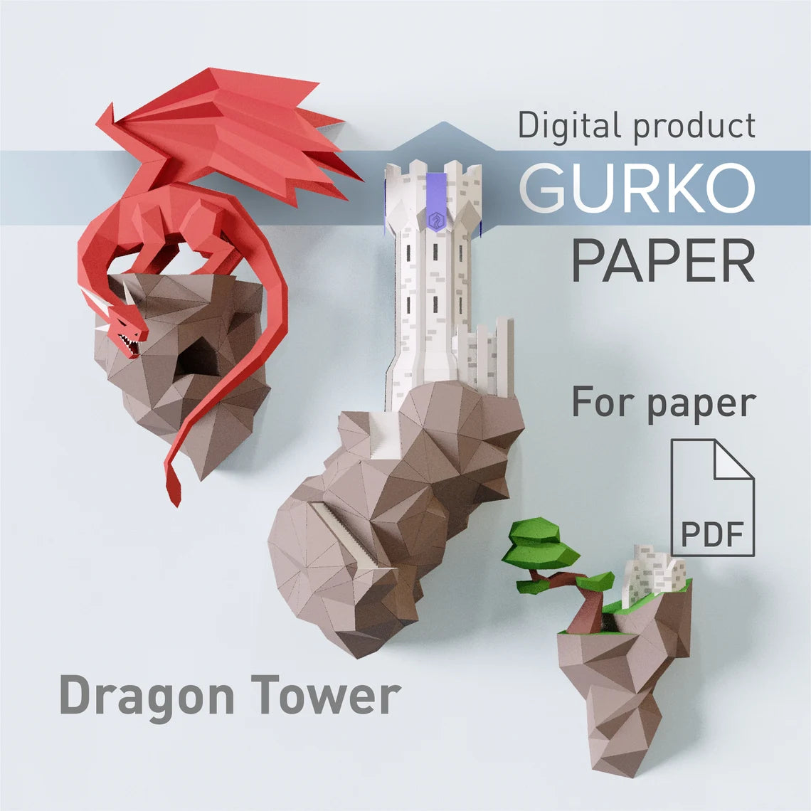 L'île volante en papercraft. Tour du dragon, modèle numérique, téléchargement PDF, Gurko, 3D low poly, Pepakura, sculpture en origami bricolage, décoration en papier